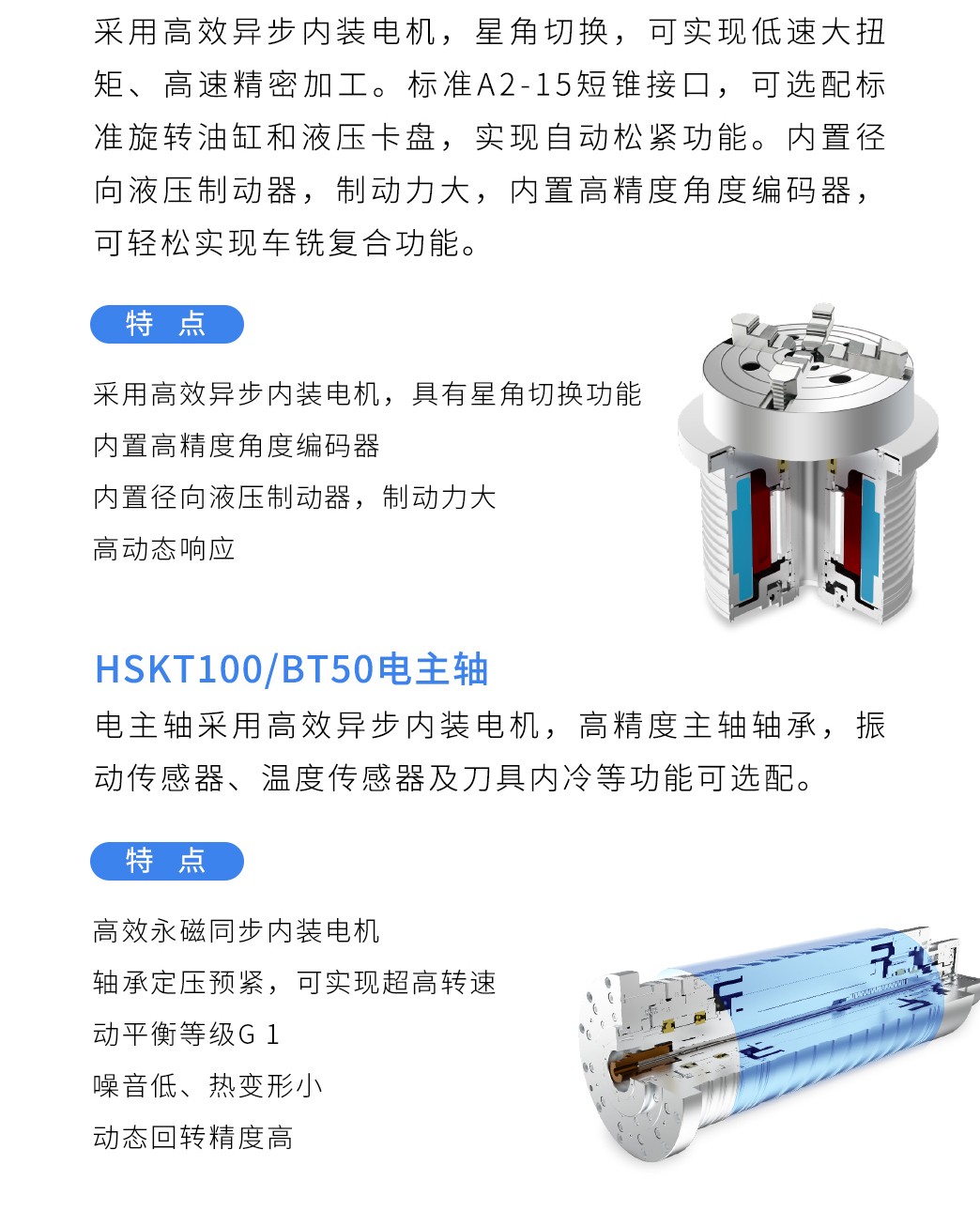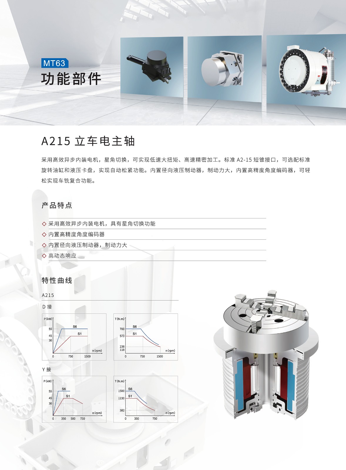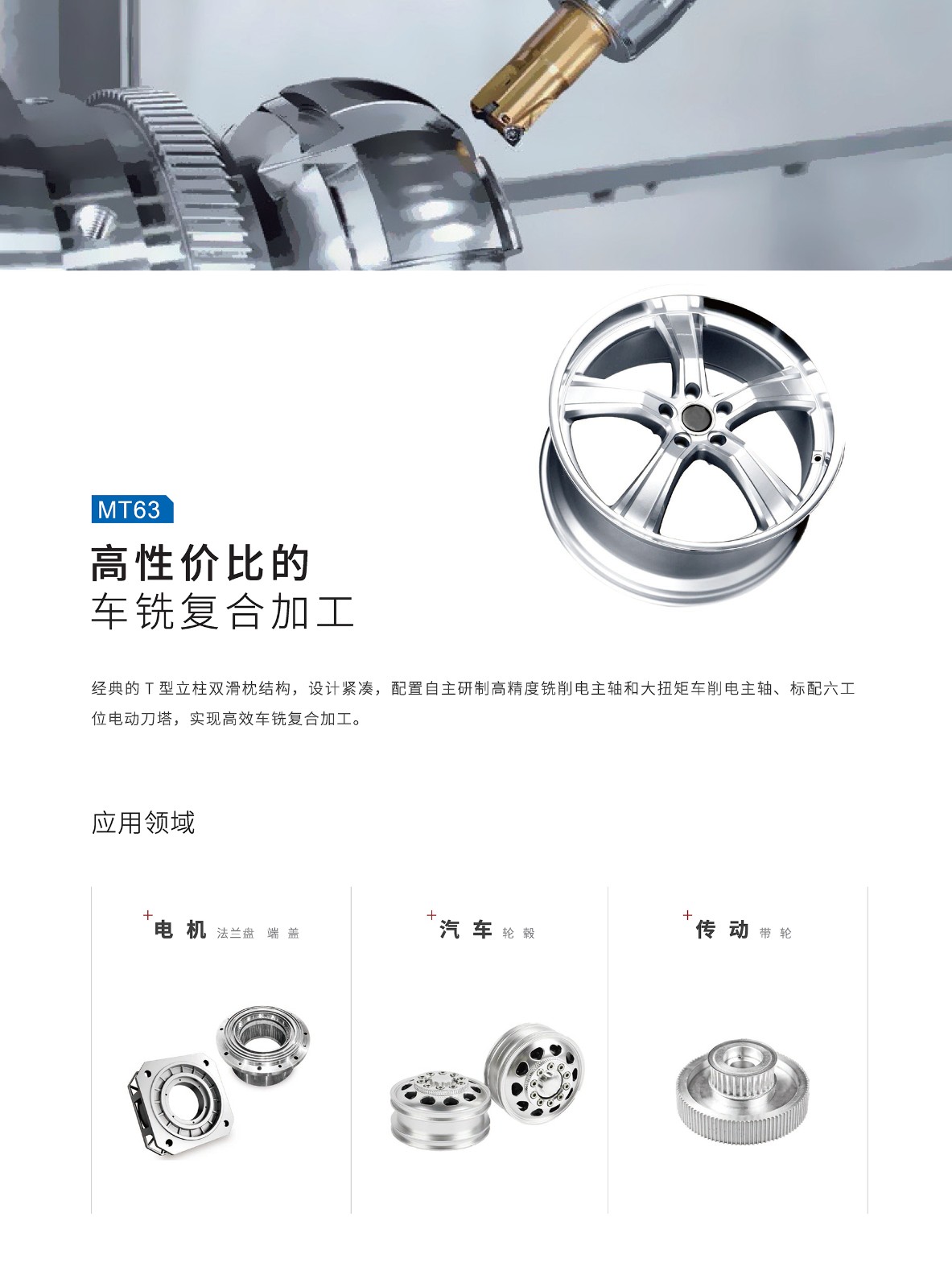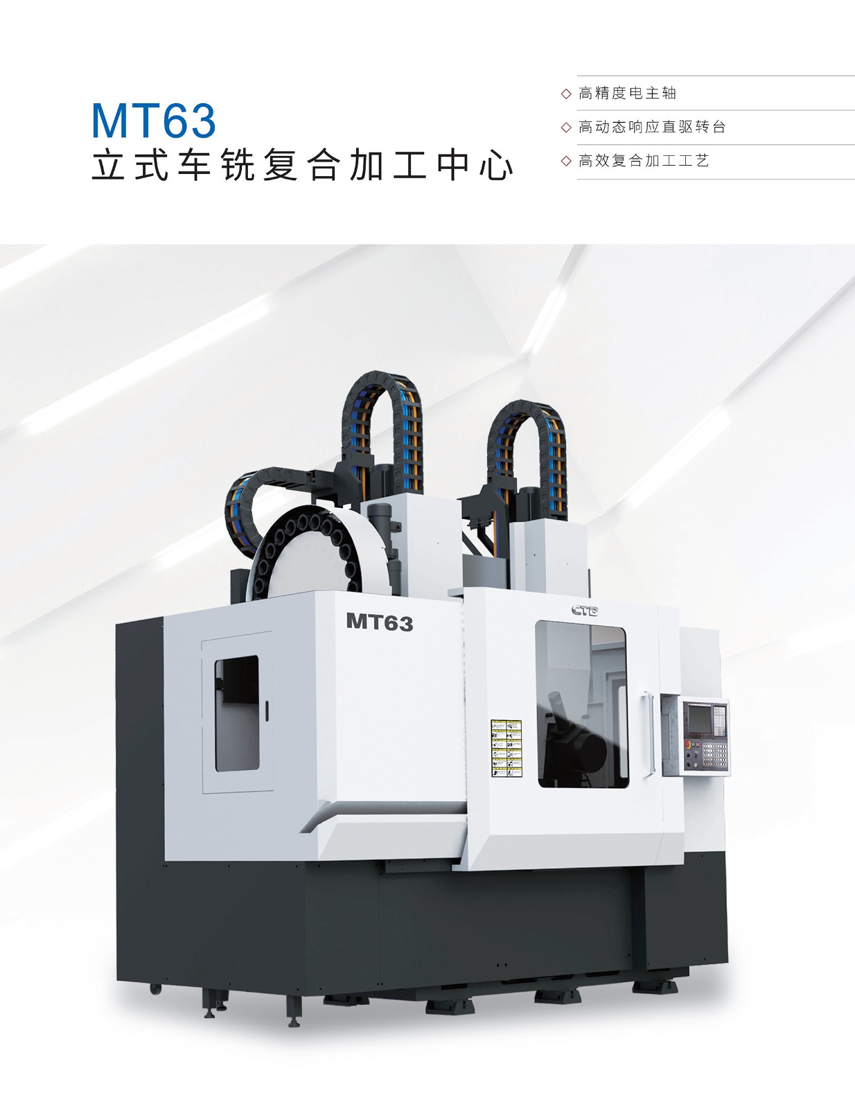 【概要描述】经典的T型立柱双滑枕结构,设计紧凑,配置自主研制高精度铣削电主轴和大扭矩车削电主轴,标配六工位电动刀塔,实现高效车铣复合加工。